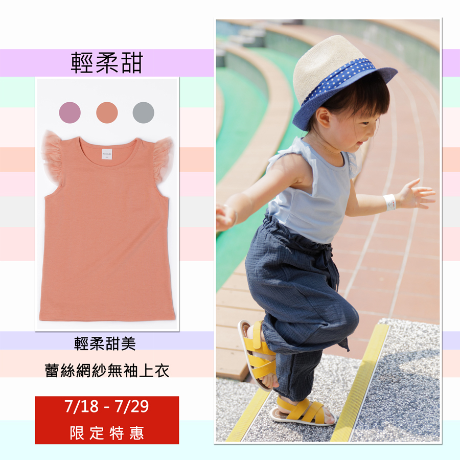 小女孩夏季穿來,會非常舒服的一款,手臂處是極輕的蕾絲網紗墜飾;衣身富有彈性,即便拉扯/洗衣,也可維持版型。配色上可看出明顯是大人取向,反而更顯出寶貝甜美氣質! 柔軟 + 彈性兼容並蓄,就算久穿,還是會像剛套上那樣輕爽!
