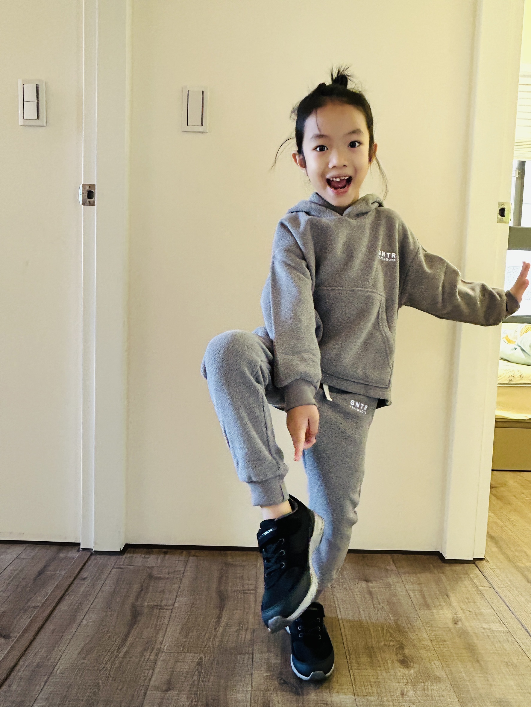 - 採用輕量保暖的抓絨布料,休閒長褲的褲腳具有彈性,腰際可以調整,實穿非常修身好看,可惜很快就斷貨!目前僅有灰色M (上衣跟褲子都是) 1套現貨。版寶約120,所以整體看起來非常合身,是有點小件了