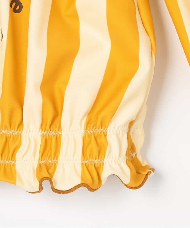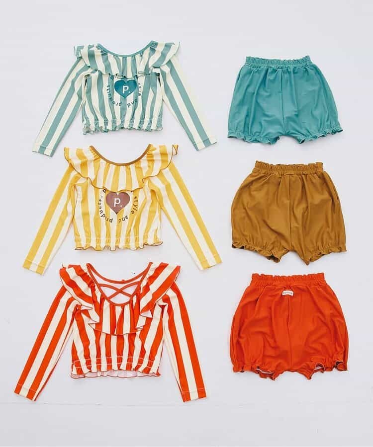 充滿活力的繽紛色系,在上衣跟褲子上都添加了女孩感的荷葉邊,具有抗UV機能